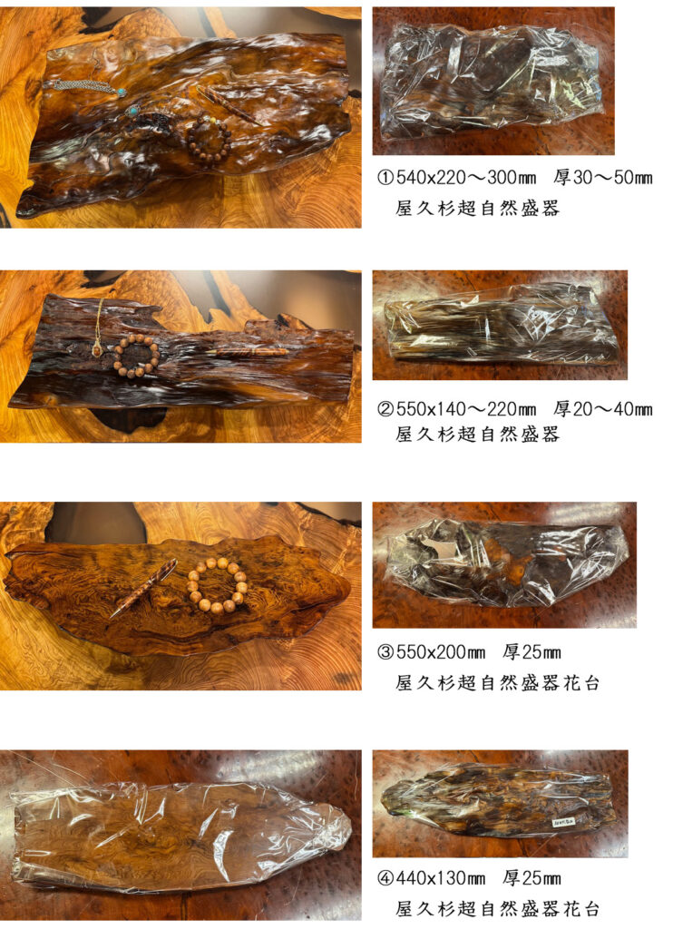 特に屋久杉表面部分のあぶらが多く自然の姿が保っている部分を盛器花台に仕上げました