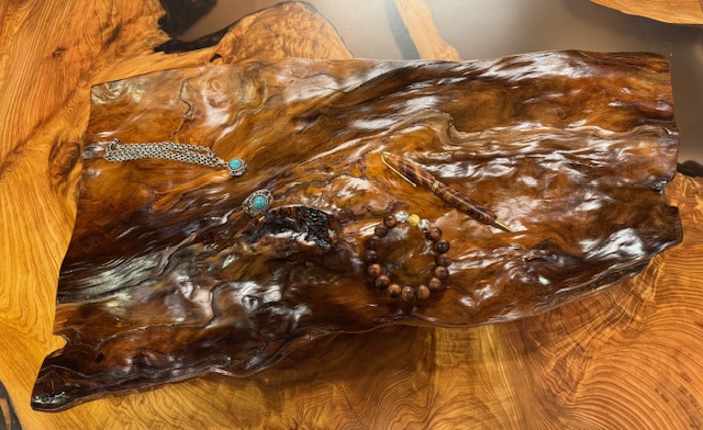 特に屋久杉表面部分のあぶらが多く自然の姿が保っている部分を盛器花台に仕上げました